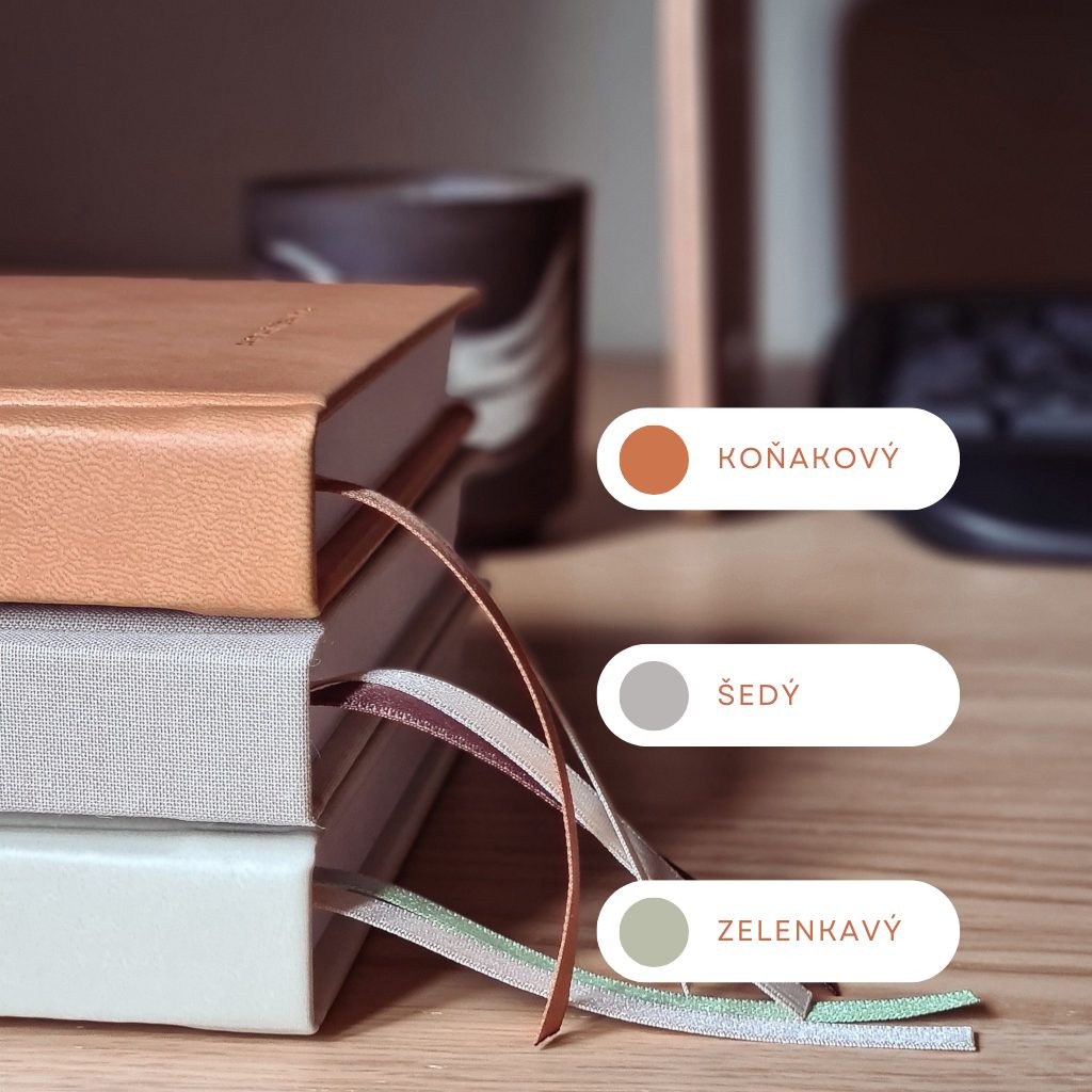 Nedatovaný diář je nyní dostupný ve více stylových variantách. Pokud preferuješ minimalistický a elegantní vzhled, zvol si šedý látkový potah, který je nadčasový a má výraznější strukturu, což z něj dělá jedinečný hmatový zážitek. Novinkou je světle modrý látkový potah, který působí svěže, čistě a dodá tvému plánování pocit lehkosti. Pro ty, kteří upřednostňují hladší povrch a snadnější údržbu, nabízíme koženkový potah. Můžeš vybírat mezi výraznou koňakovou barvou, která dodá diáři osobitý styl, nebo decentním zelenkavým odstínem, který působí klidně a sofistikovaně.