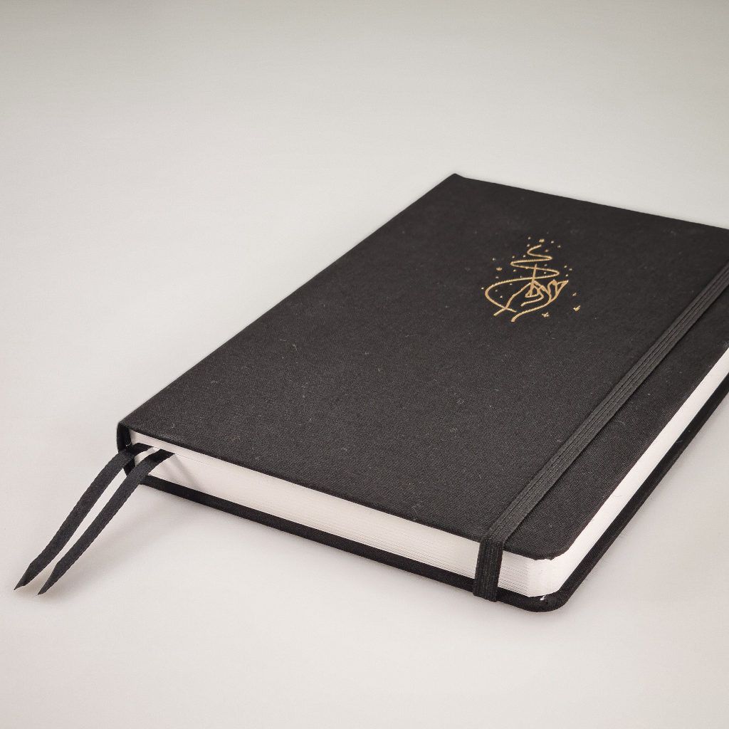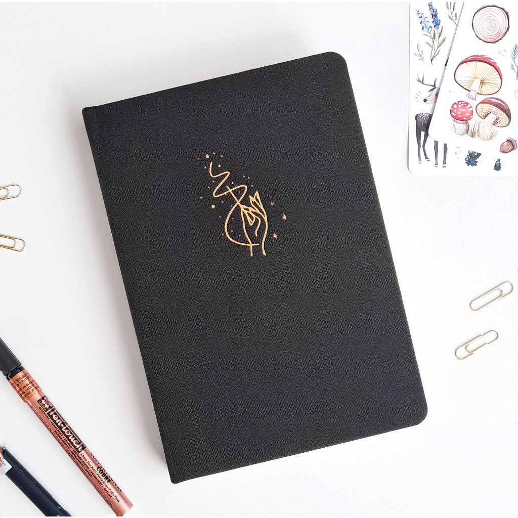 Náš Bullet Journal zápisník vyrábíme v Česku a má kvalitní zpracování. Deník má pevné desky potažené černým látkovým potahem. Přední desky zdobí krásná zlatá ražba autorské kresby naší grafičky. Zápisník má zaoblené rohy, což je pohodlnější při manipulaci. Aby se ti zápisník samovolně neotvíral, přidali jsme elastickou gumičku na zavírání. Pro maximálně praktické používání jsme přidali 2 stužky na založení stránek. Pokud uvítáš i praktickou kapsičku, můžeš si ji přikoupit ZDE.