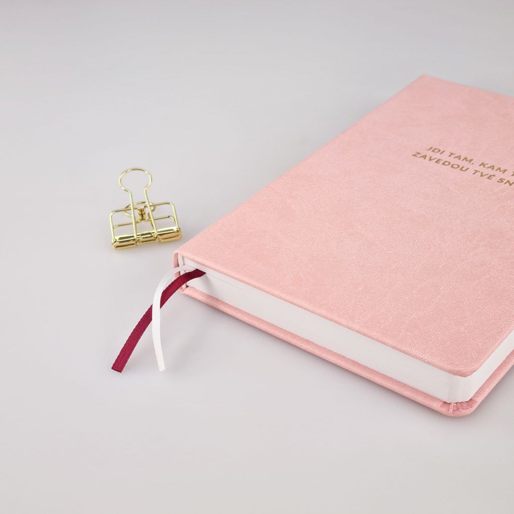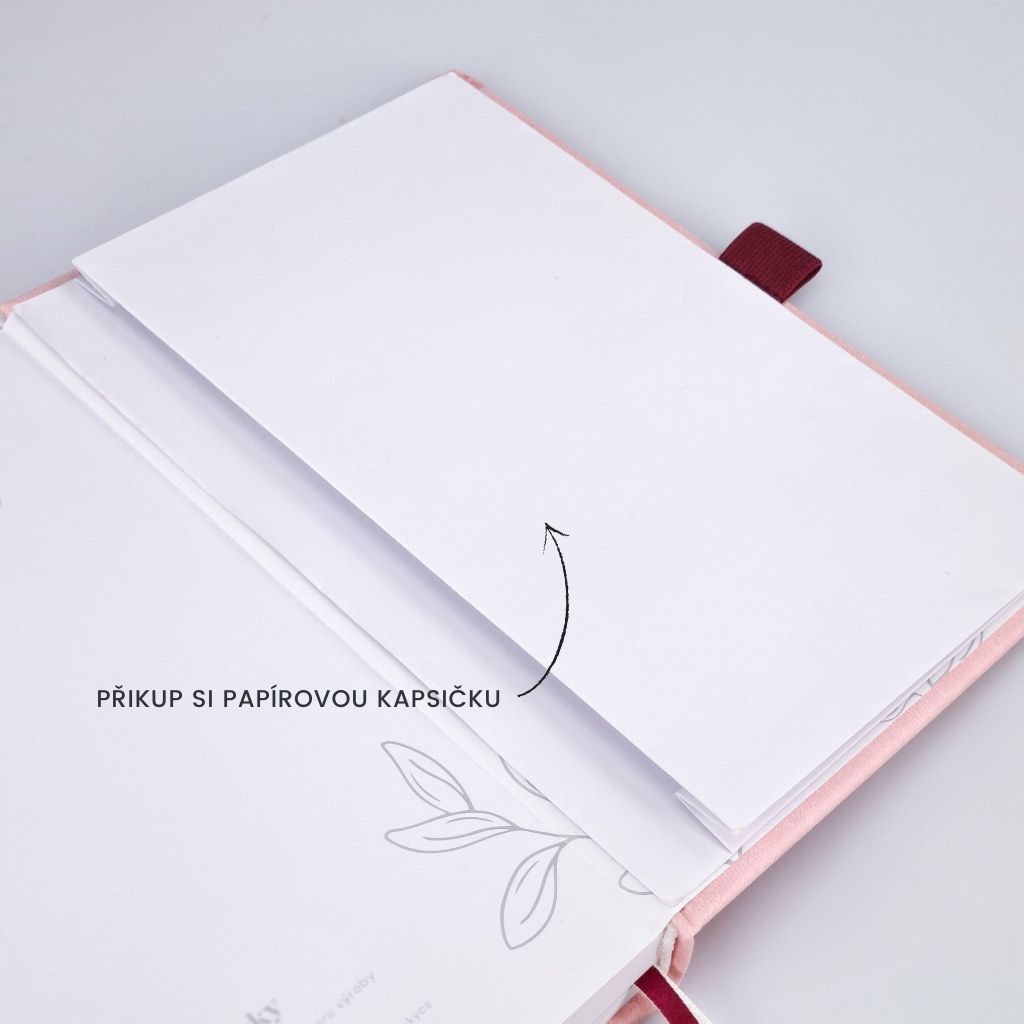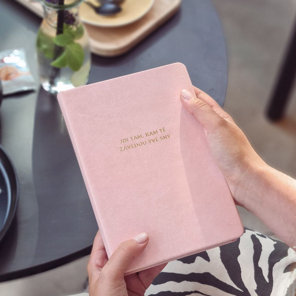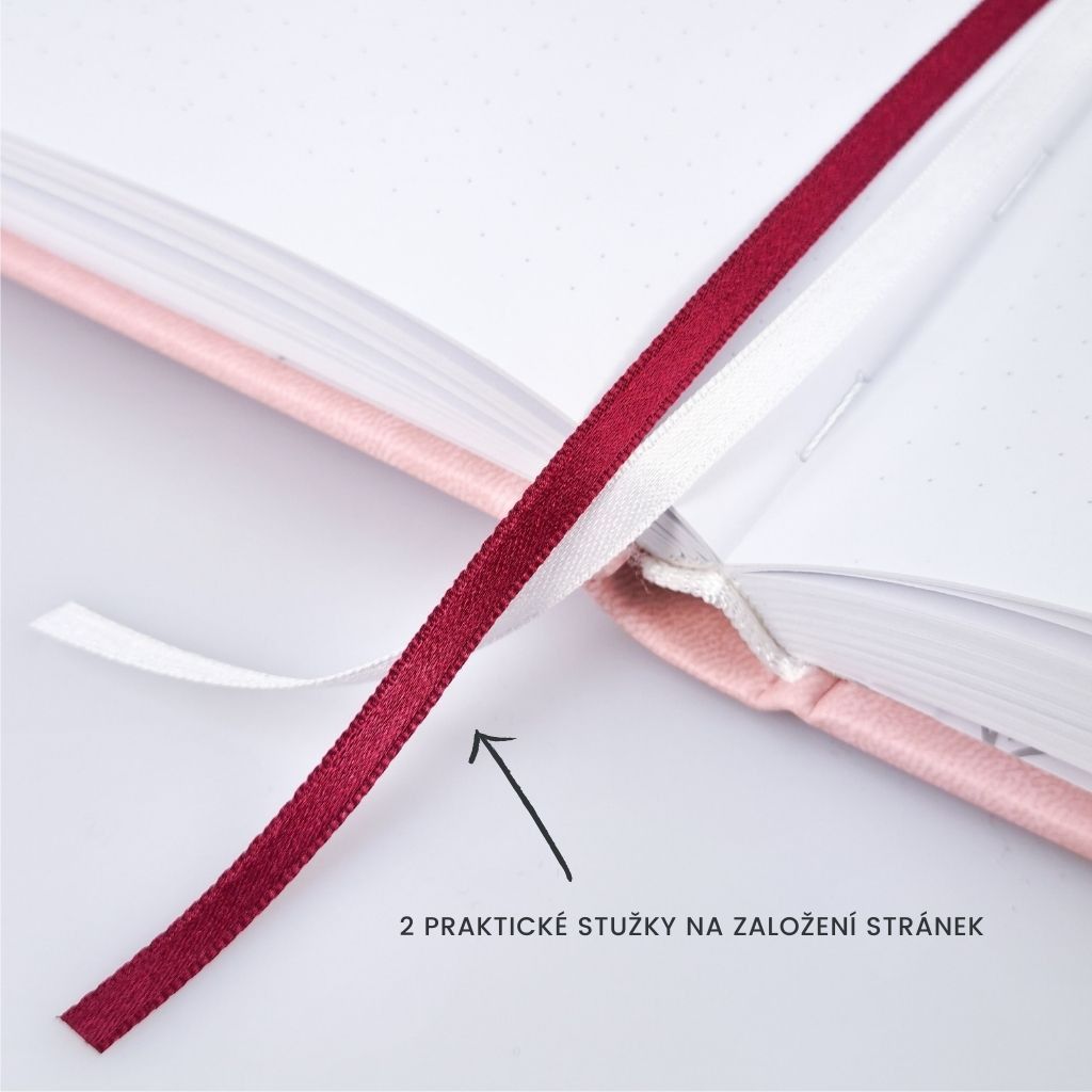 Náš Bullet Journal zápisník vyrábíme v Česku a má kvalitní zpracování. Deník má pevné desky potažené odolnou koženkou v elegantní růžové barvě. Přední desky zdobí krásná zlatá ražba - najdeš tam citát, který tě bude neustále motivovat a nutit k zamyšlení. Zápisník má zaoblené rohy, aby byl pohodlnější při manipulaci. A aby se ti zápisník samovolně neotvíral, přidali jsme elastickou gumičku na zavírání. Pro maximálně praktické používání jsme přidali 2 stužky na založení stránek. Pokud uvítáš i praktickou kapsičku na úschovu drobností, můžeš si ji přikoupit ZDE.
